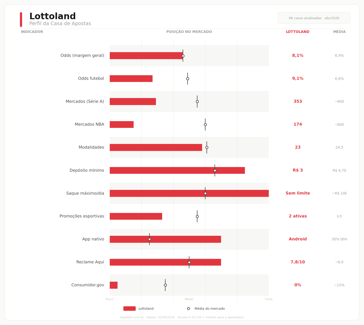 | Parâmetro | Lottoland | Média do mercado (67 ops.) |