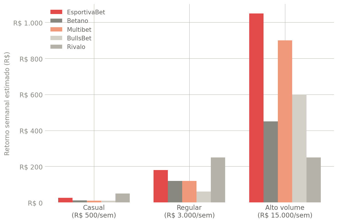 A equipe Legalbet analisou 58 promoções de cashback cassino em 30 operadores licenciados pela SPA/MF. Os 5 selecionados combinam percentual alto, teto elevado e condições transparentes nos T&C. Abaixo, a mecânica de cada oferta, tabelas de faixas e dados do ReclameAqui.